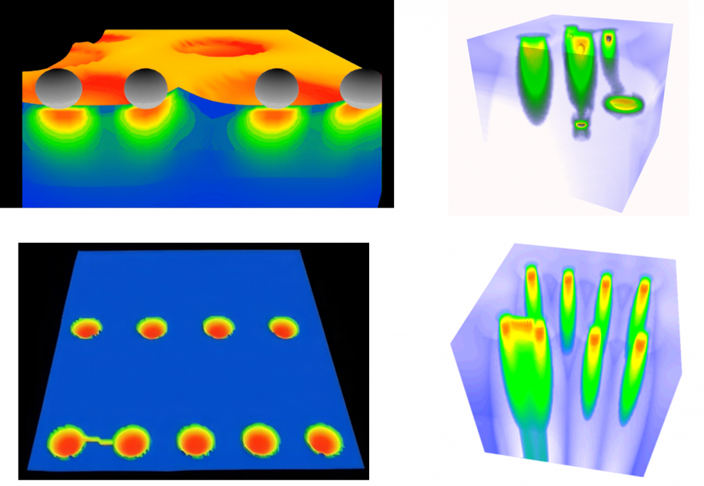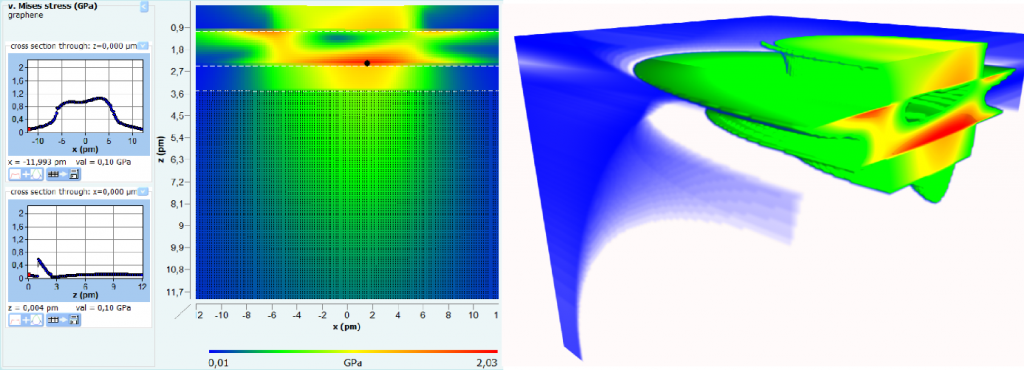 The work on 2D materials like graphene (bottom left image) pushed us towards to look closer at small scale effects, leading us to dive into molecular dynamics simulations. The calculation of interactions between atoms and molecules and understanding how these influence failure will bring new insights to understand the macroscopic material behaviour in both experimental and applied fields. The last two images (bottom center and right) show results from this ongoing project. This (or maybe the combination of these simulations) brings us closer to a holistic understanding of the application performance of complex material structures.