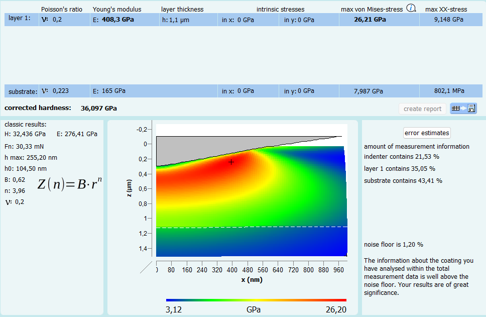 OPfC® first fits the load–depth curve to determine the true coating modulus. It then computes the full stress–strain field throughout the coating/substrate system. When plastic deformation occurs in the coating, the peak von Mises stress is reported as the coating yield strength. The von Mises stress distribution is displayed directly on the OPfC® results page (see Figure 2).