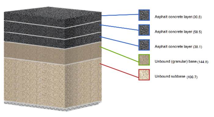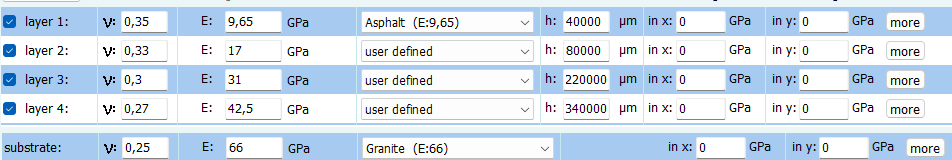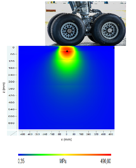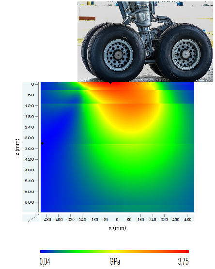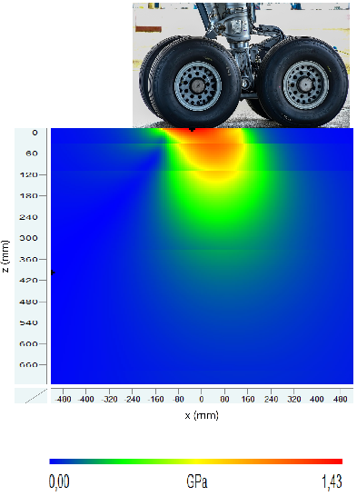 We were recently asked to simulate typical contact situations on an airport runway. We used real German federal pavement data (4 layers: 4 cm, 8 cm, 22 cm and 34 cm) and actual tire contact pressures.