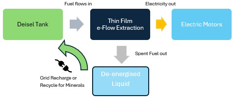 We considered a different path (see NL#133 – A Rechargeable Fuel) — turning those barriers into strengths. Because we don’t burn the diesel, the spent fluid can be recharged from the grid or reprocessed for its trace minerals — creating a circular, multi-use fuel cycle using existing infrastructure.