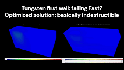 In our latest project (see gif images below), we demonstrate SIO’s scale-invariant FilmDoctor® software optimizing a fusion chamber first wall against multiple plasma generated particle impacts (particles not shown). The goal for Fusion operators is to extend the life of the first wall to approximately 20 years before replacement.