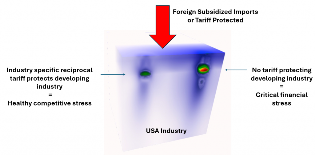With broader industry information, specific subsidy or import tariffs against US products may trigger a weak point in other areas of the economy – The FilmDoctor® field model approach can show under what circumstances and where in the socio-economy failure can occur given suitable input data. Yes, even with dynamic time dependent data.